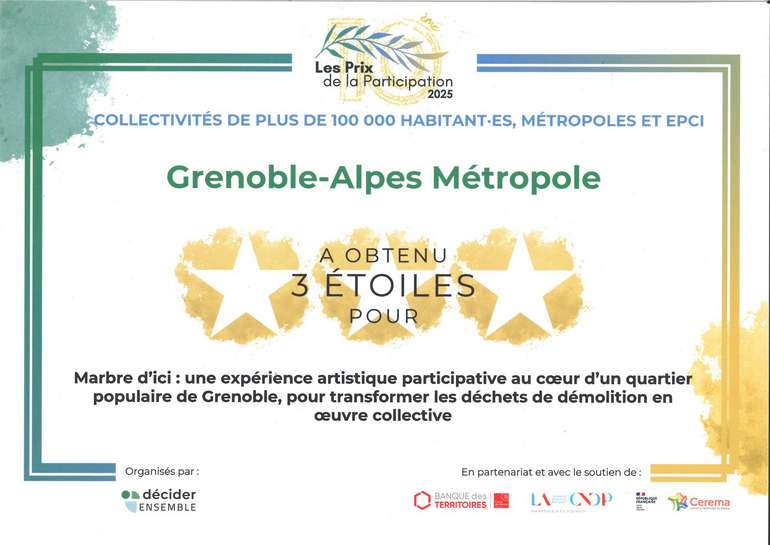 Le projet "Marbre d'ici - Place Rouge", porté par Grenoble-Alpes Métropole en collaboration avec l'artiste Stefan Shankland, vient d'être distingué par du prix 3 étoiles aux Prix de la Participation organisés par Décider Ensemble. Cette récompense salue une démarche exemplaire qui a su transformer l'art en vecteur d'inclusion et de participation citoyenne au cœur du quartier populaire des Villeneuves de Grenoble.