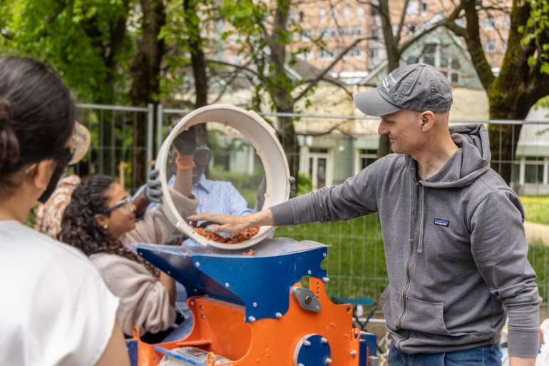 L'étape la plus spectaculaire ? Les deux semaines de concassage participatif entre le 14 et le 25 avril 2025. Plus de 300 personnes – enfants, adolescents, familles – se sont retrouvées devant la Maison des Habitants pour transformer ensemble les gravats en matière première. Au programme : casser des briques au marteau, pédaler sur le vélo-concasseur, tamiser les granulats, couler des mini-prototypes. Résultat : 10 tonnes de matière première produites collectivement pour créer l'œuvre définitive.