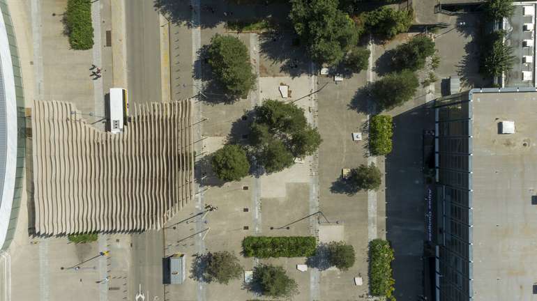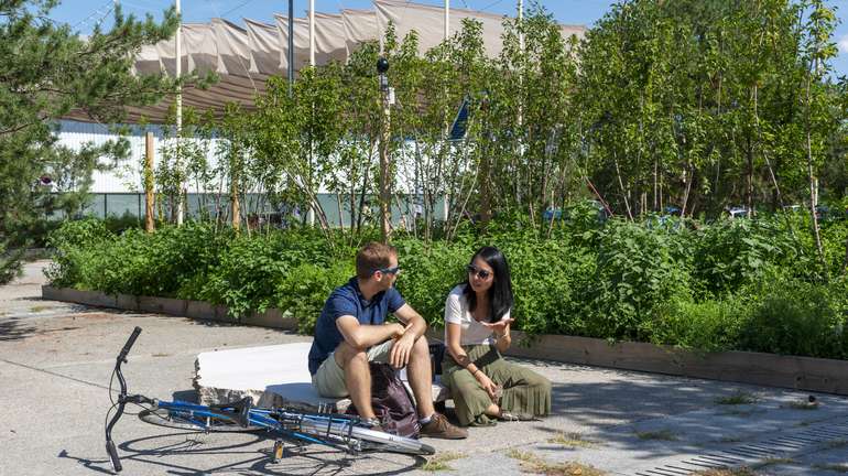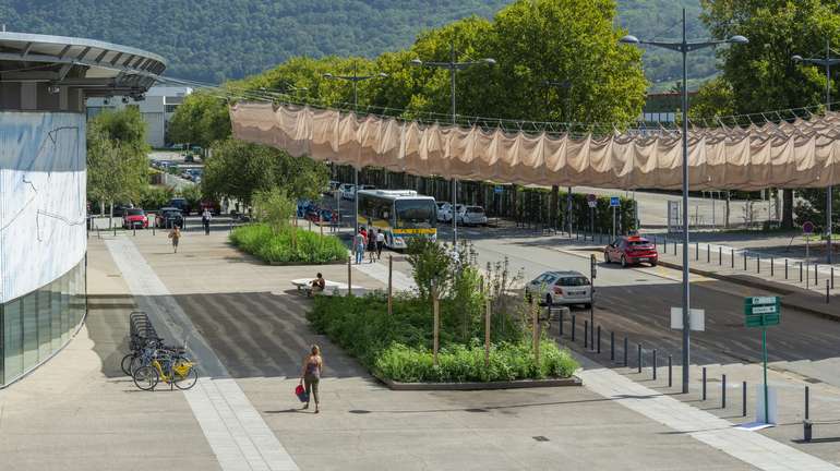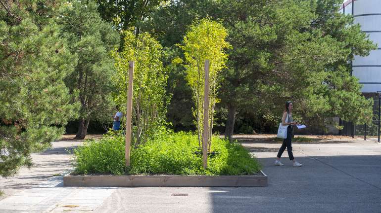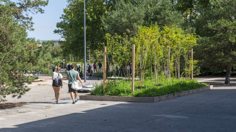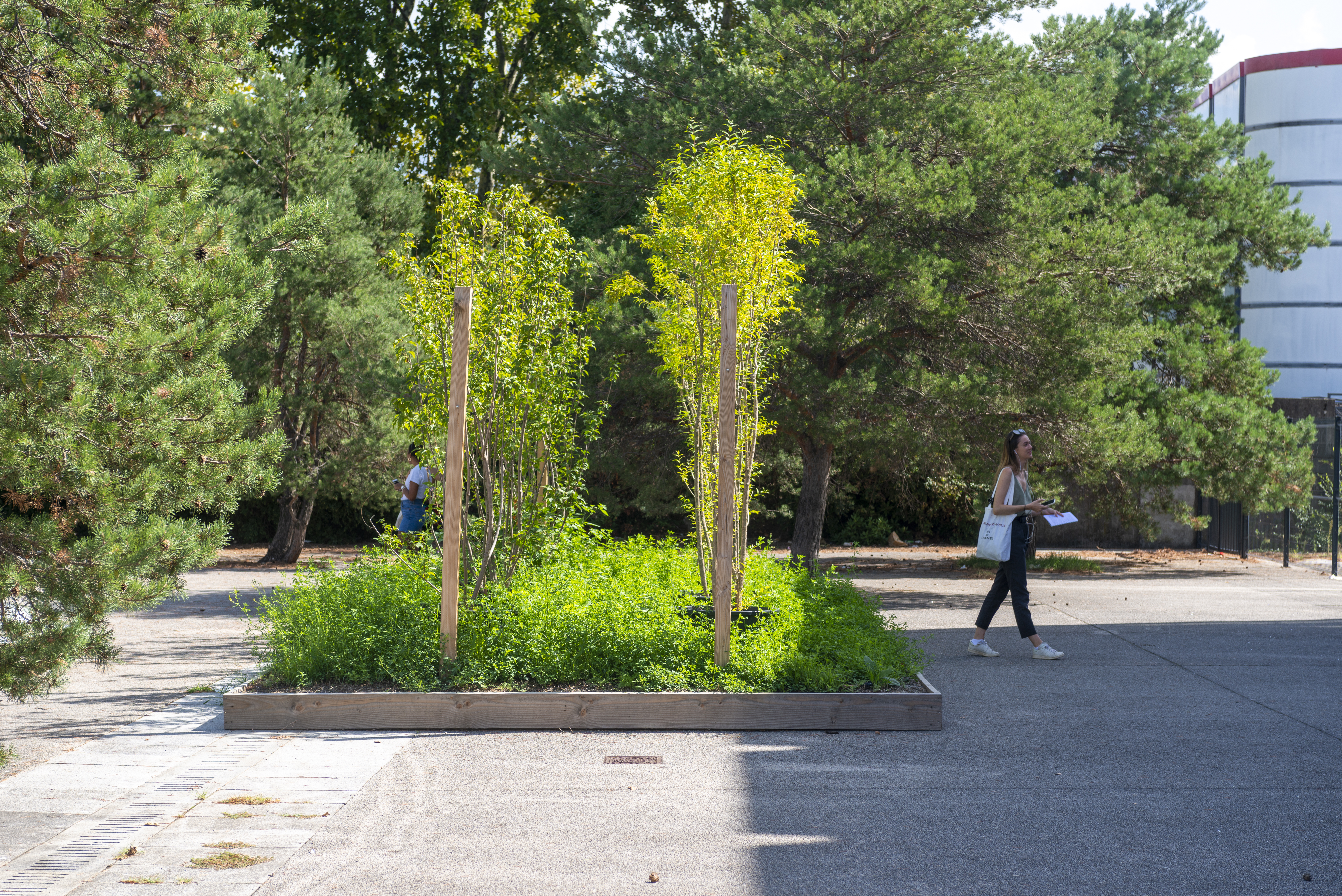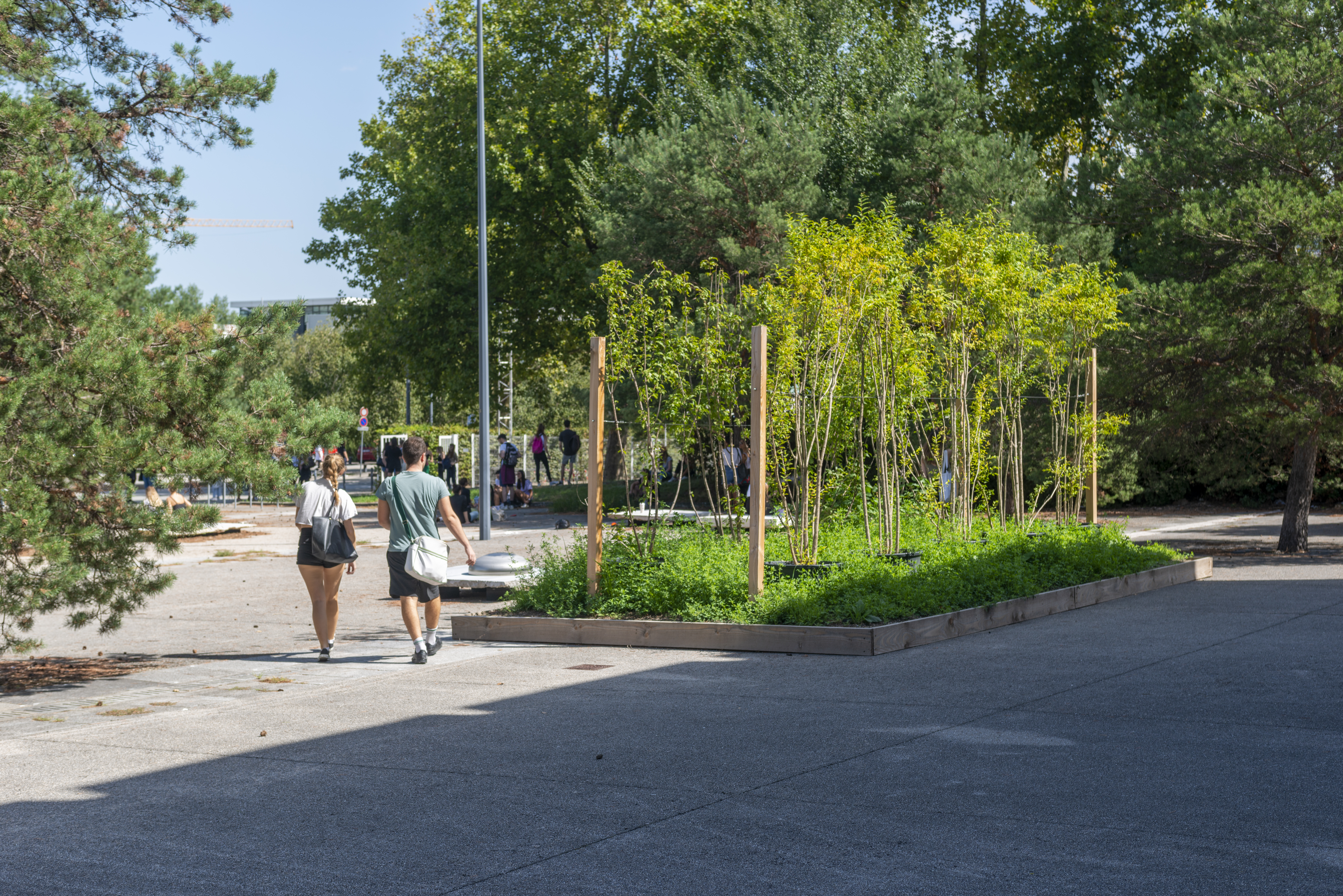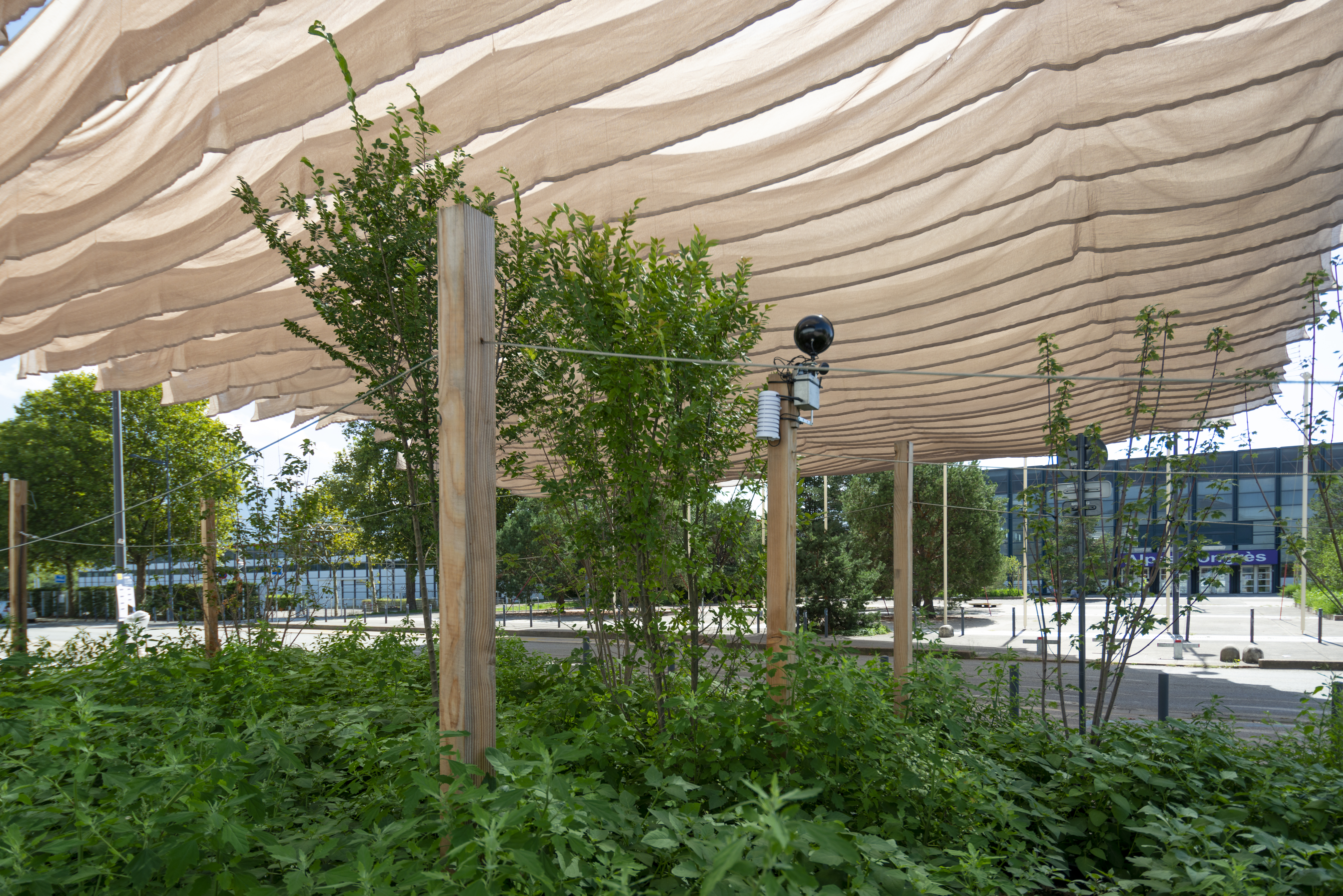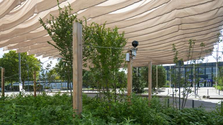 - Un expérimentation : Elle a ainsi déployé une expérimentation de 18 mois - le jardin bioclimatique - entre le printemps 2022 et l'automne 2023, afin de tester des dispositifs permettant d'apporter de l'ombrage et de la fraîcheur sur un espace minéral sans pouvoir y planter d'arbres. Cette expérimentation visait également à alimenter les réflexions pour le futur réaménagement du site.
