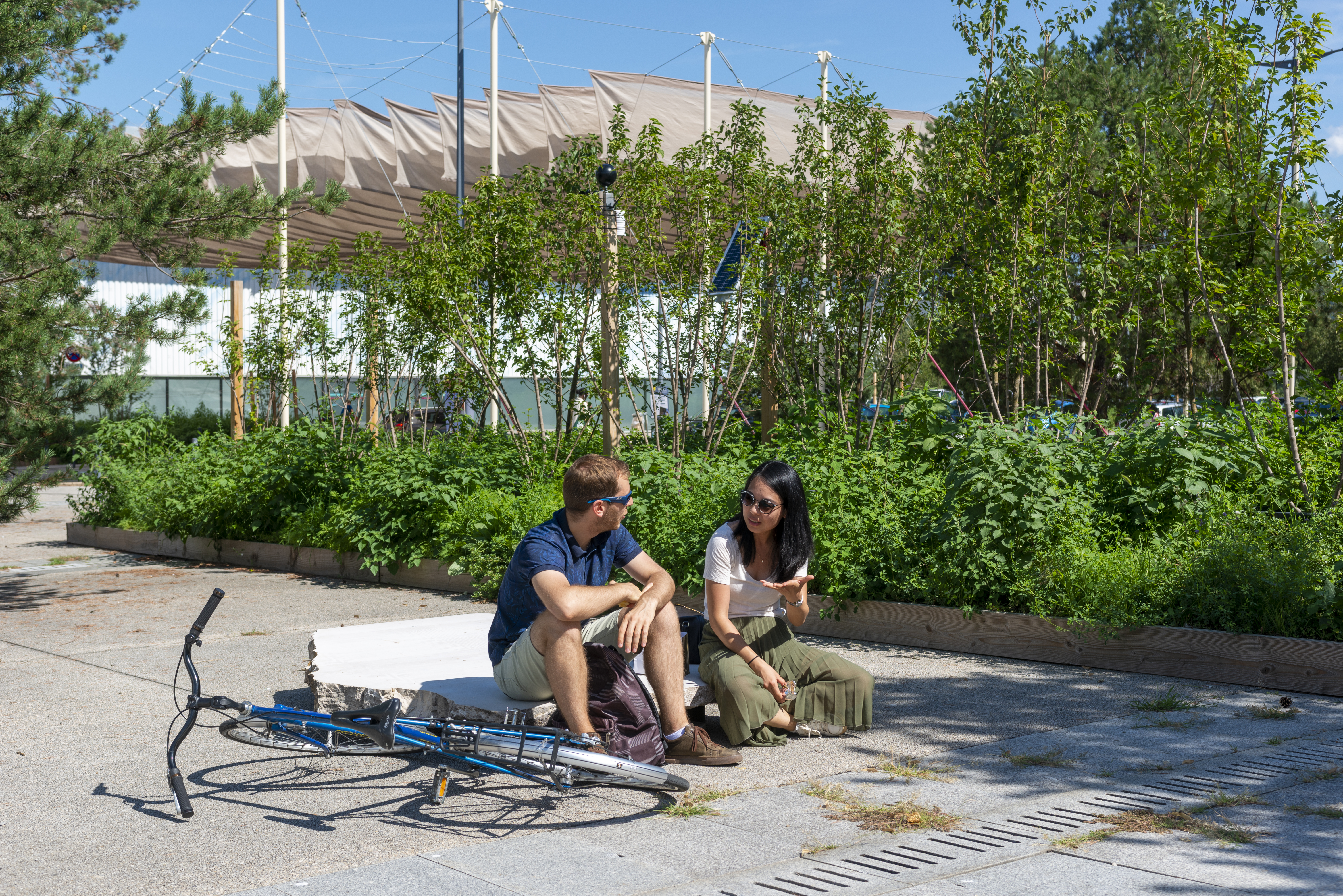 Manger le midi, s’assoir pour lire un livre, attendre le début d’un match à la patinoire ... pour permettre ces nouveaux usages plusieurs mobiliers ont été installés pour profiter de l’ombre.