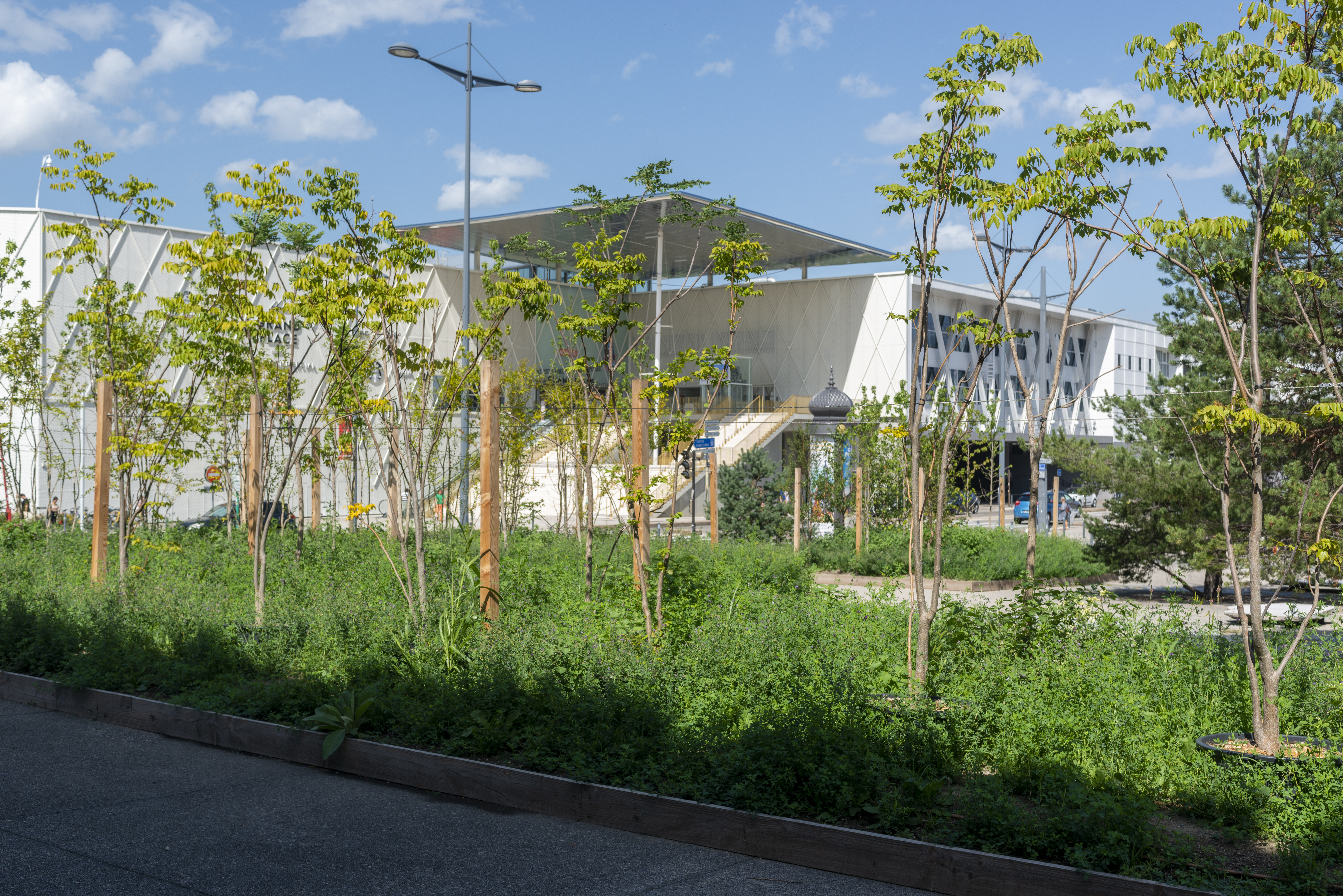 - Au pied des arbres, une strate basse de graminées et de vivaces permet de renforcer la présence de la végétation sur la place tout en conservant l’humidité. Elle permet également de récupérer les eaux de pluie.
