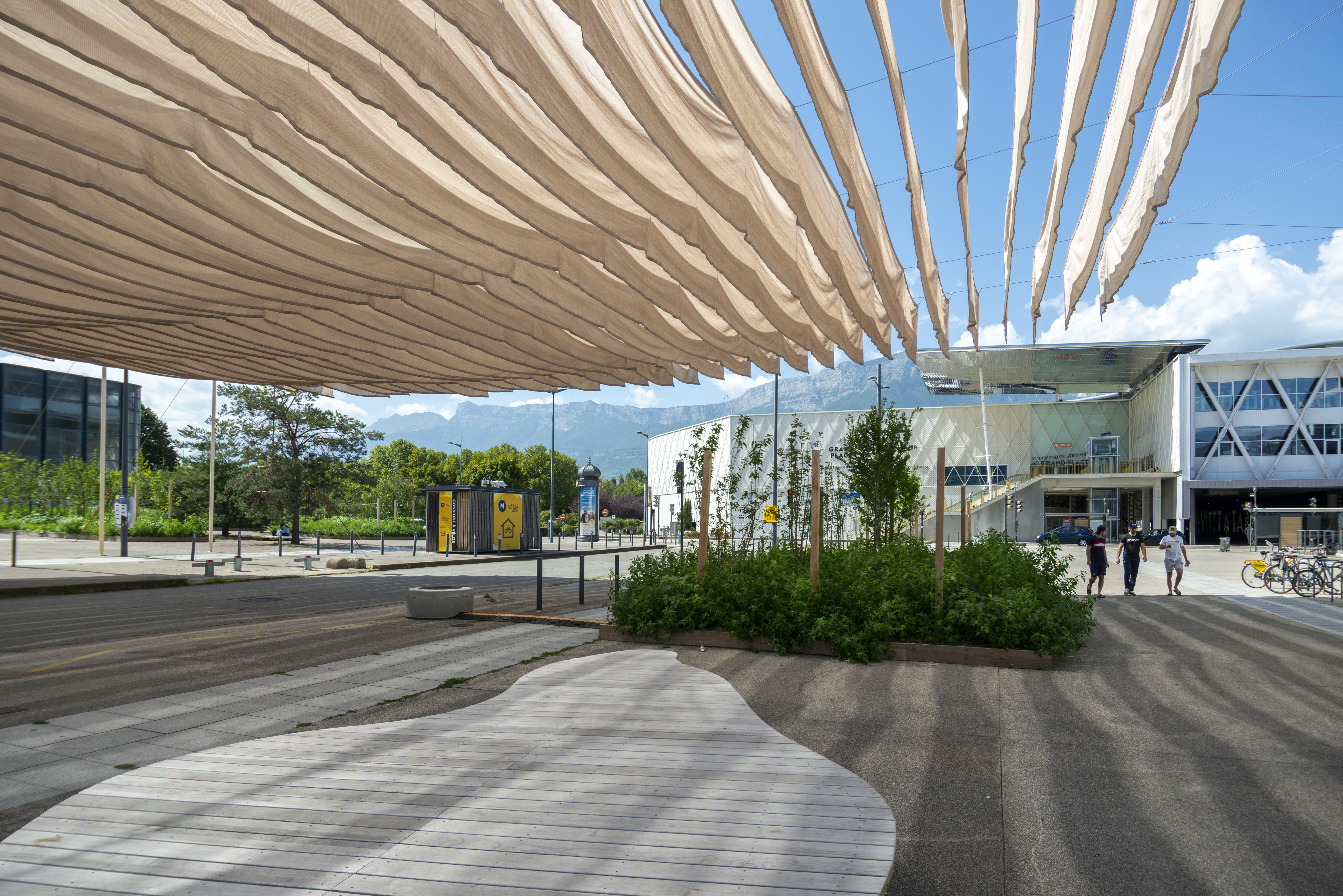 Pour apporter ombre et fraicheur aux endroits les plus ensoleillé du parvis, un grand vélum composé de longs voiles tendus a été dressé au-dessus de la rue Henri Barbusse.