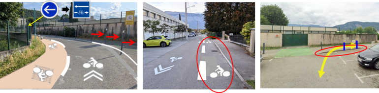 - Remplacement de la chicane simple du n°6 par une écluse (afin d’éviter les déports devant la sortie de la résidence) : pincement des 2 côtés, avec bypass vélo en sens descendant uniquement.